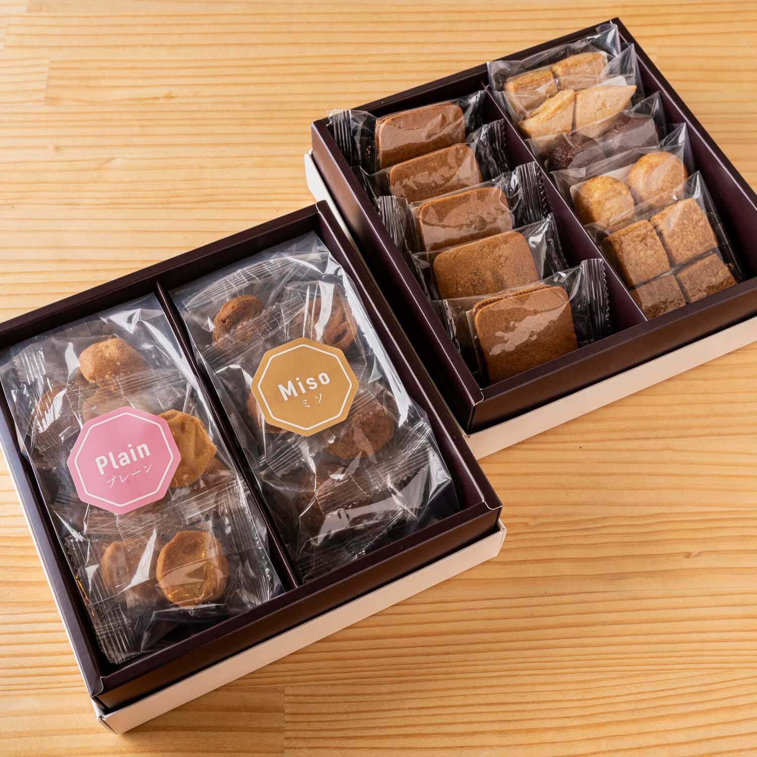 ベーゴマクッキーと麦味噌キャラメルサンド、そしてハレバターサブレのギフトセットです。